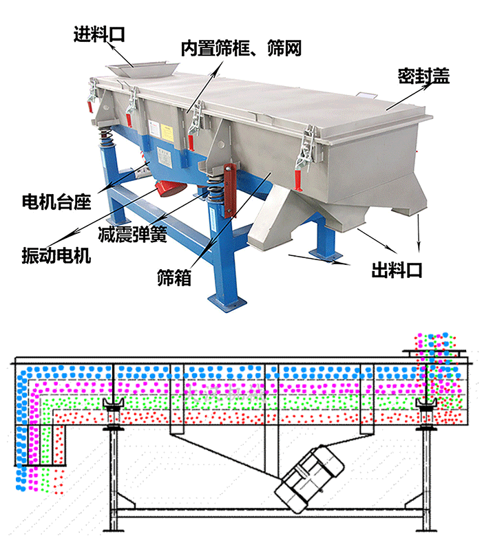 直線篩于直線振動(dòng)篩是一樣的產(chǎn)品其結(jié)構(gòu)可簡(jiǎn)單分為:進(jìn)料口、篩機(jī)蓋、篩板、出料口、彈簧和電機(jī)。