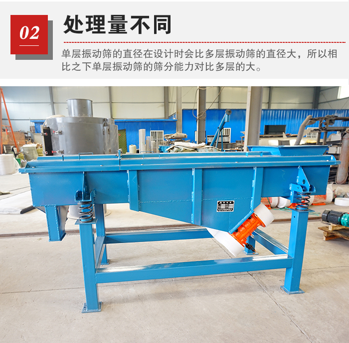 物料篩分產(chǎn)量是由篩網(wǎng)的直徑,也就是物料與篩網(wǎng)的接觸面積有直接關(guān)系的。而單層振動篩的直徑在設(shè)計(jì)時會比多層振動篩的直徑大,所以相比之下單層振動篩的篩分能力對比多層的大。