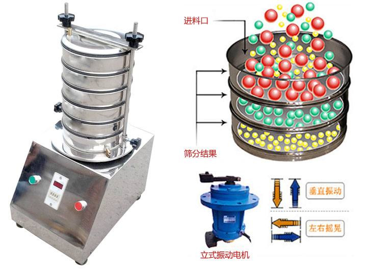 準(zhǔn)試驗(yàn)篩是以YZU立式振動(dòng)電機(jī)作為整機(jī)振動(dòng)源,通過(guò)振動(dòng)電機(jī)帶動(dòng)上部振動(dòng)盤(pán)振動(dòng),再通過(guò)振動(dòng)盤(pán)傳導(dǎo)至安放在振動(dòng)盤(pán)上部Φ200篩框上,然后由需要檢測(cè)目數(shù)的篩框把小于篩面網(wǎng)孔的物料顆粒篩分至下層篩框,如此層層篩選,使每層試驗(yàn)篩內(nèi)只留相同粒度的物料,達(dá)到不同粒度的分離并確定此物料的粒度組成,使Φ200型篩框中的物料能非常有效的起到過(guò)濾、分級(jí)、篩分目的。