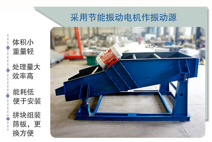 該產品 具有體積小、重量輕,能耗低、便于安裝及工藝布置等特點,采用振動電機作振動源,橡膠彈簧支撐并隔振,處理量大,篩分效率高,篩網有較大的安裝傾角,拼塊組裝篩板,更換方便,使用壽命長。