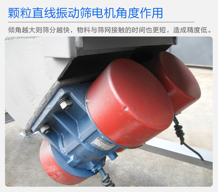 顆粒直線振動(dòng)篩電機(jī)的安裝角度是可以調(diào)整的,角度不一樣,其產(chǎn)生的振幅大小也不一樣,一定傾角的直線振動(dòng)篩,可以有效的提高篩分產(chǎn)量,增大生產(chǎn)效率,傾角越大,則篩分越快,物料與篩網(wǎng)接觸的時(shí)間也更短,則篩網(wǎng)使用年限也會(huì)增加,角度過大。則容易造成篩分精度達(dá)不到,影響篩分質(zhì)量,所以顆粒直線振動(dòng)篩的振動(dòng)電機(jī)在安裝時(shí),角度的選取很重要,客戶在開機(jī)使用直線振動(dòng)篩前,應(yīng)根據(jù)生產(chǎn)需求,調(diào)整好角度,一般直線振動(dòng)篩廠家在篩機(jī)出廠前,將其角度調(diào)整為45度。