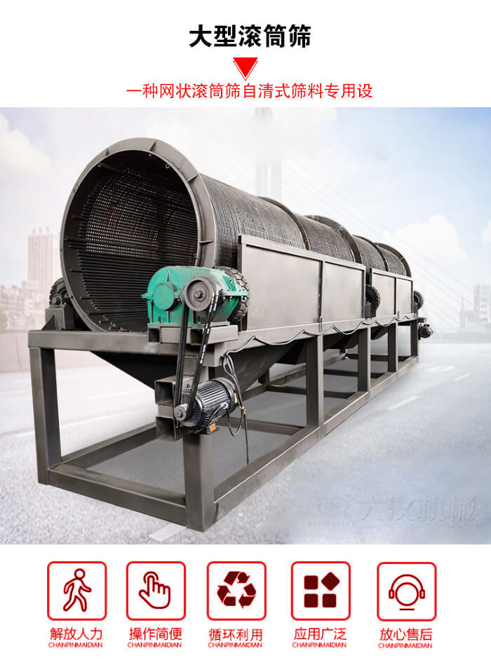 大型滾筒篩,因其獨特的結構特點,完全有效地解決了其他型式篩分設備所存在的缺點,是綜合利用電站的篩型。是繼國內(nèi)各大公司生產(chǎn)的普通型網(wǎng)狀滾筒篩之后的自清式篩料專用設備。